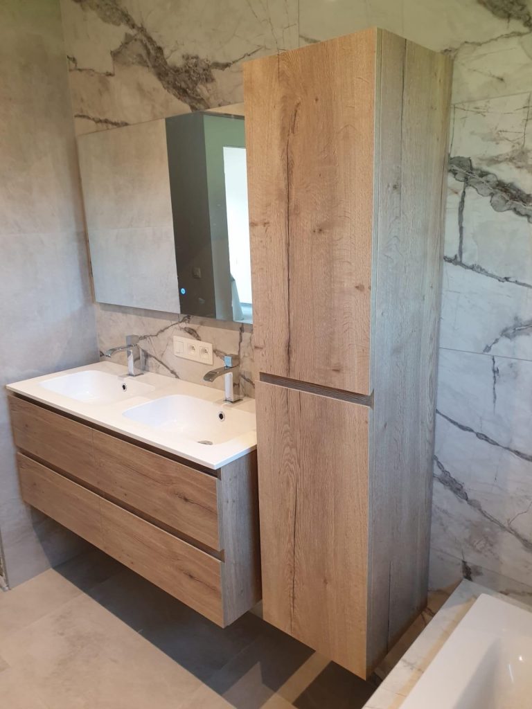 Le mobilier en bois naturel apporte une note chaleureuse et intemporelle. Combiné au revêtement mural effet marbre, il crée un contraste élégant où modernité et raffinement se rencontrent.
